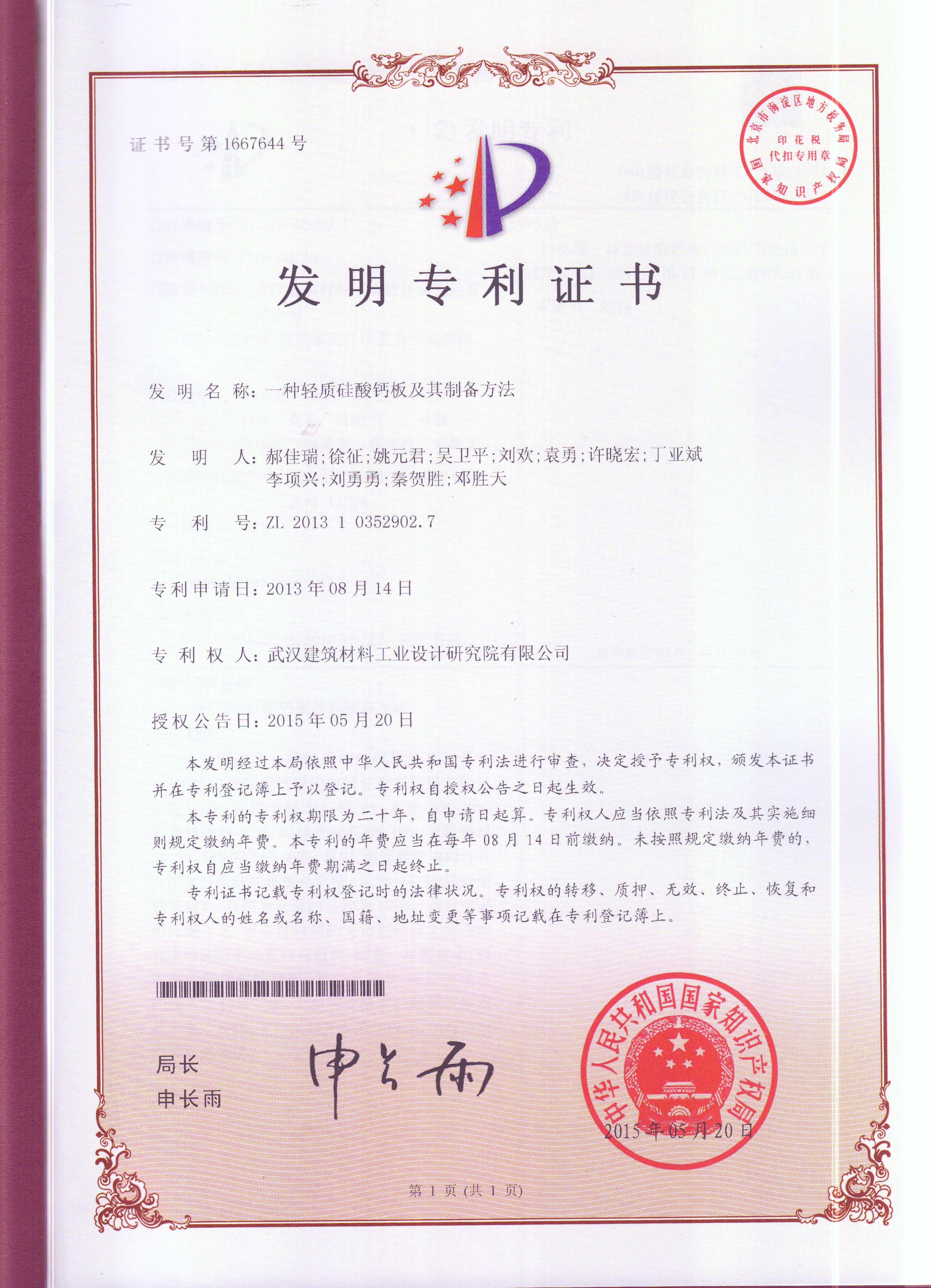 專利證書(一種輕質(zhì)硅酸鈣板及其制備方法)