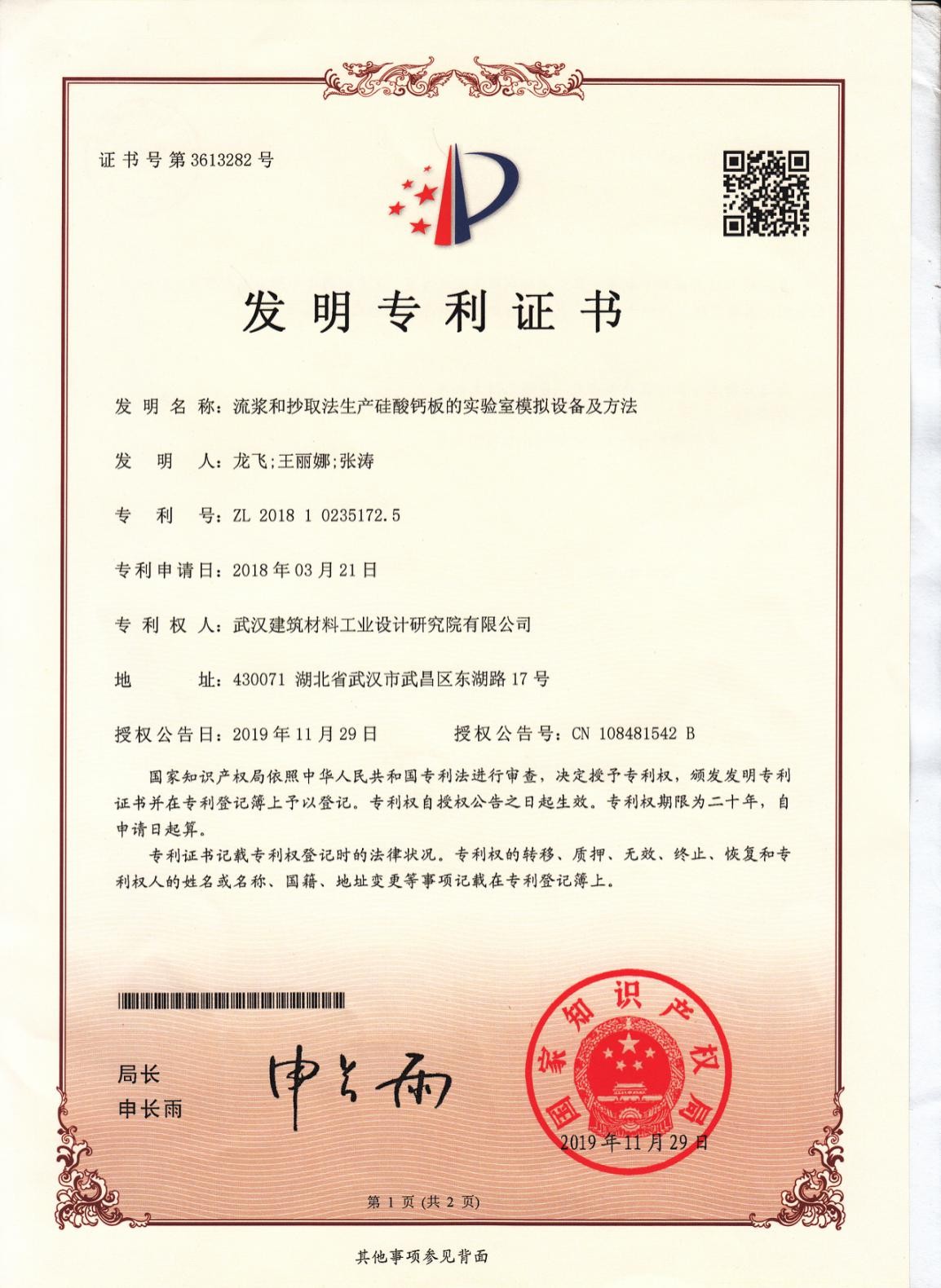 專利證書(流漿和抄取法生產(chǎn)硅酸鈣板的實驗室模擬設(shè)備及方法)
