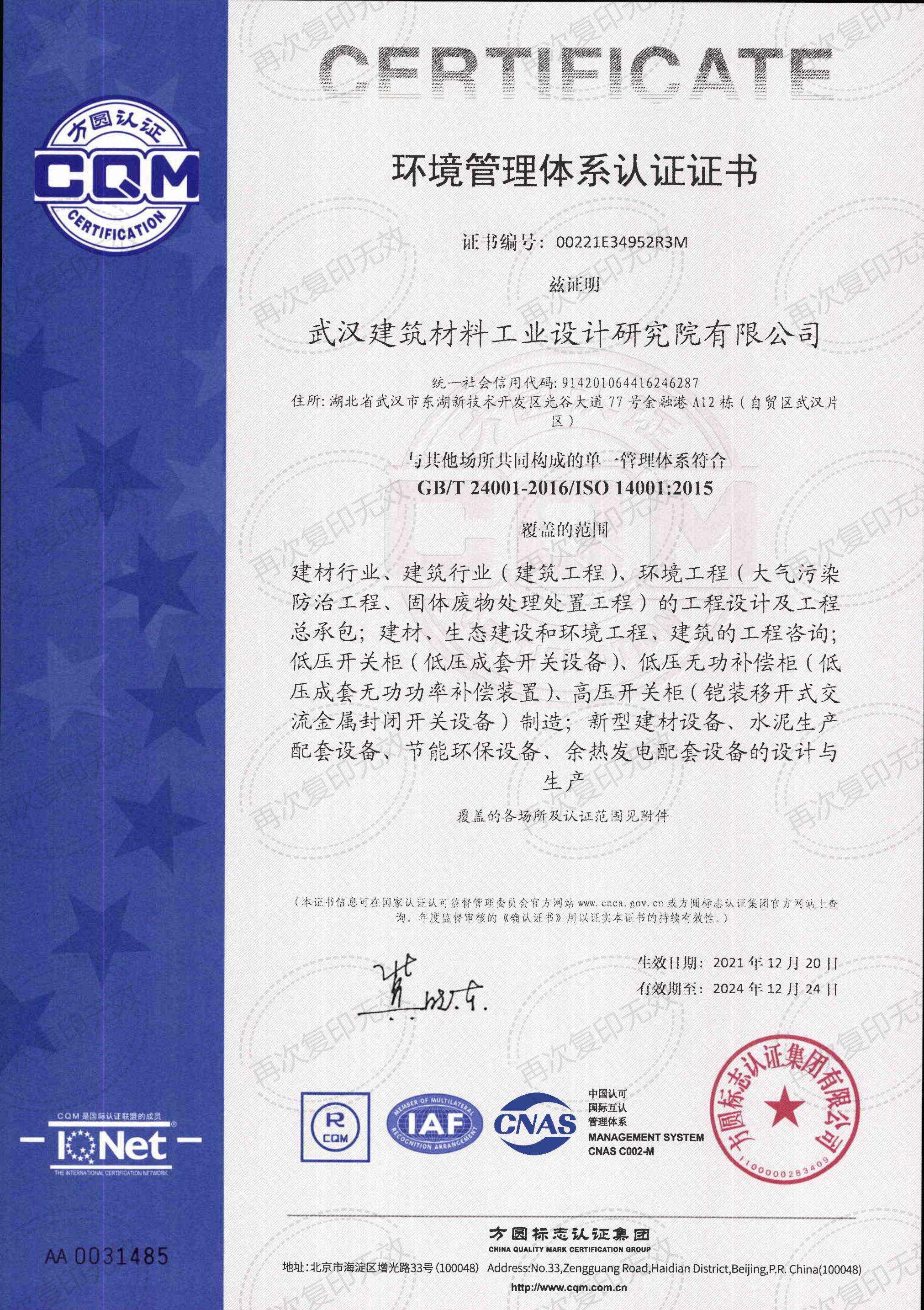 工程設(shè)計甲級資質(zhì)證書(建材行業(yè);環(huán)境工程)