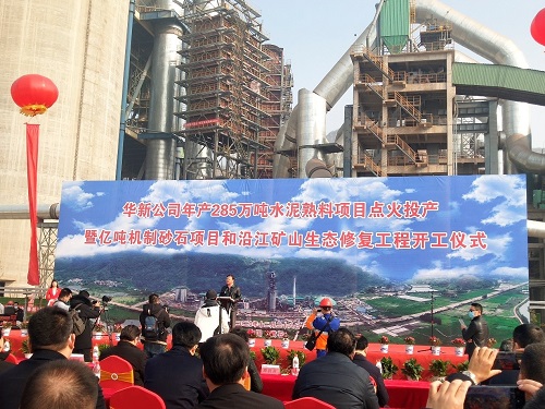 2020年12月28日,我公司姚元君董事長受邀參加華新水泥股份有限公司年產(chǎn)285萬噸水泥熟料項目點火投產(chǎn)暨億噸機制砂石項目和沿江礦山生態(tài)修復工程開工儀式。