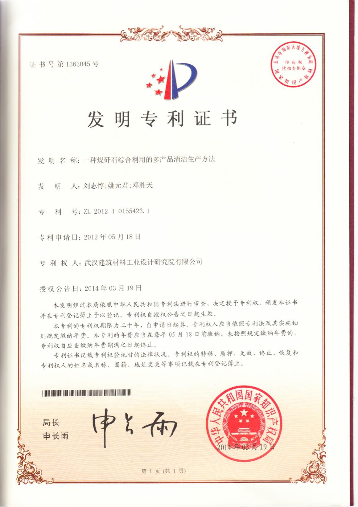 專利證書(一種煤矸綜合利用的多產(chǎn)品清潔生產(chǎn)方法)