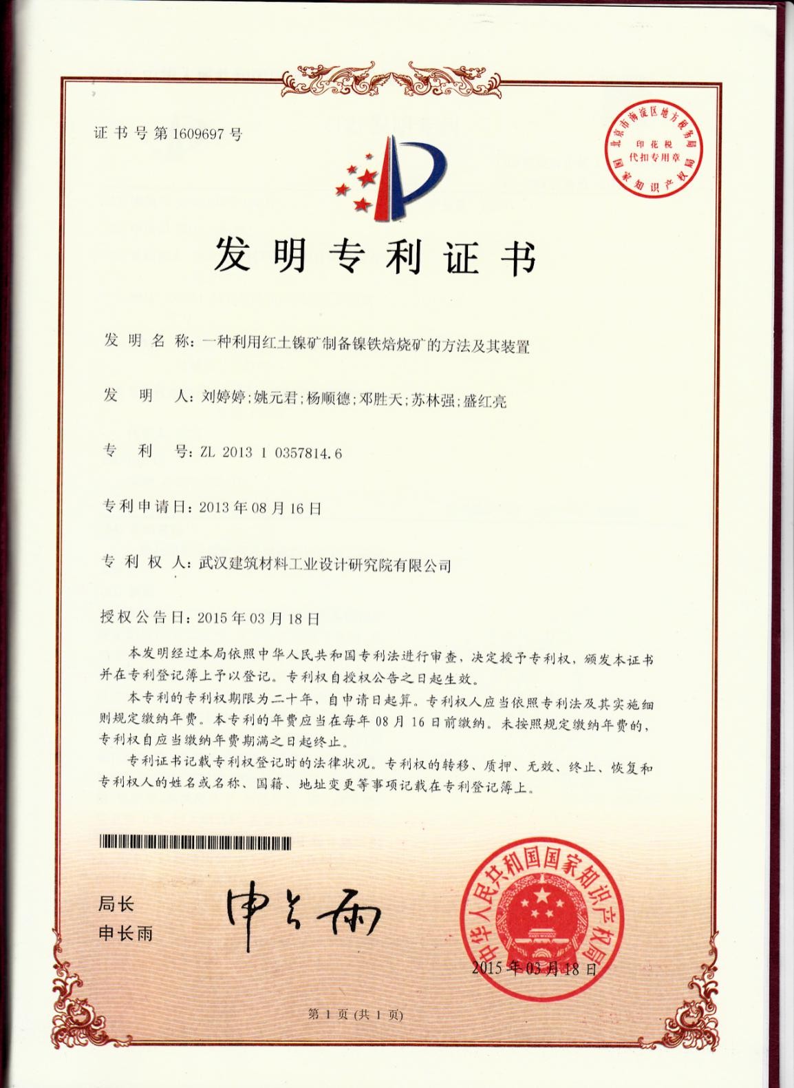 專利證書(一種利用宏圖鎳礦制備鎳鐵焙燒礦的方法及其裝置)