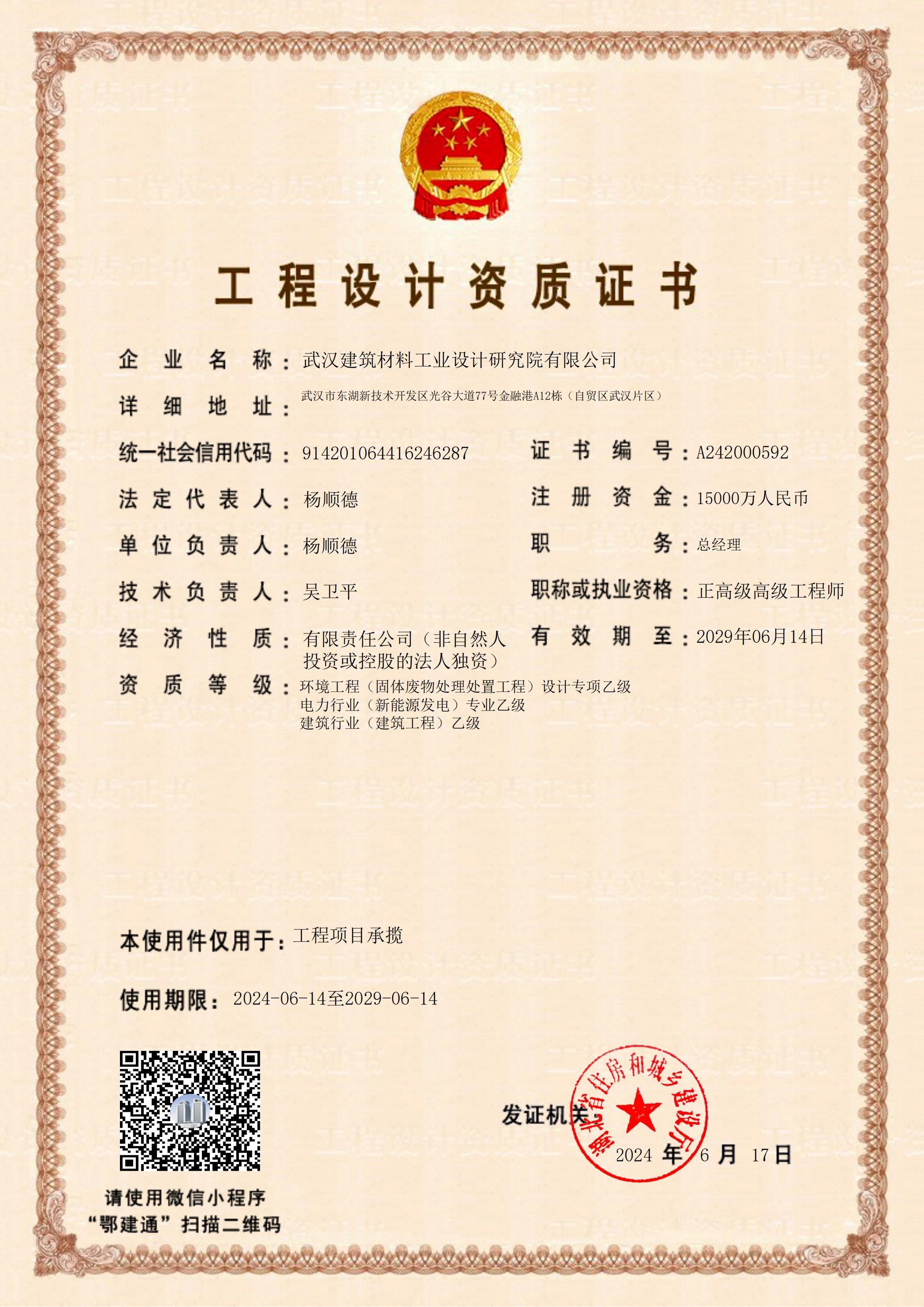工程設(shè)計甲級資質(zhì)證書(建材行業(yè);環(huán)境工程)