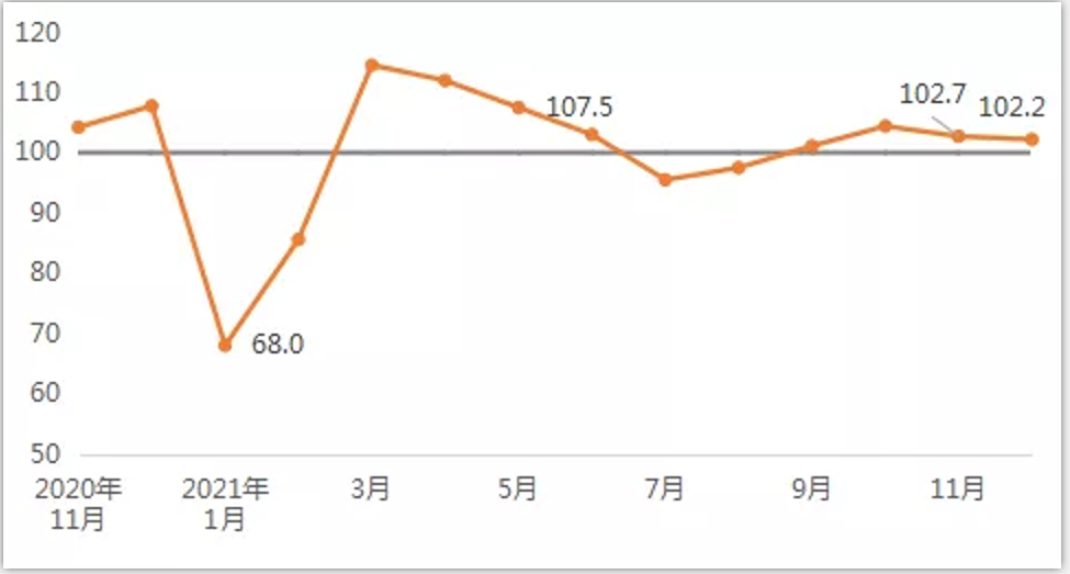 2021年,建筑材料工業(yè)年度景氣指數(shù)(MPI)109.7點,比上年回升8.9點,景氣度明顯回升。全年MPI運行呈現(xiàn)波動性態(tài)勢。上半年建筑材料生產(chǎn)活躍,3月份至6月份MPI持續(xù)高于臨界點,處于景氣區(qū)間,但建筑材料市場呈現(xiàn)供大于求的關(guān)系,價格下行態(tài)勢較為明顯。下半年建筑材料工業(yè)運行的波動性特征明顯,7、8月份受高溫、降雨、臺風(fēng)等氣候性因素以及疫情多點散發(fā)影響,MPI回落至臨界點以下,9、10月份受多地能耗“雙控”政策影響,建材生產(chǎn)有所放緩,但價格增長明顯,MPI升至景氣區(qū)間,并于11、12月份保持在景氣區(qū)間運行。
